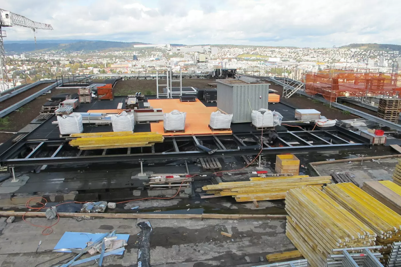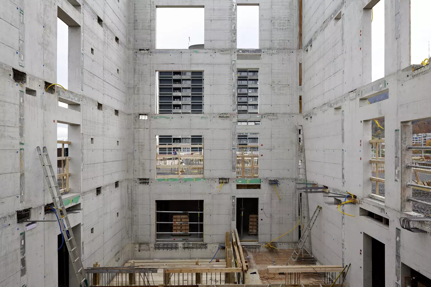 Wir zeichneten uns innerhalb des Teams verantwortlich für den Entwurf der Gebäudestatik und der Baugrube. Die Statik des Bettenhauses beruht in den Regelgeschossen auf den tragenden Kernen der Mittelschicht, sowie einem System von Scheiben und Stützen an den Randzonen. Die weitgespannten Flachdecken ergeben für die Zimmereinteilung den Fassaden entlang eine grosszügige sehr flexible Situation. Das gesamte Gebäude wurde mittels Bohrpfählen in den tragfähigen Sihlschotter fundiert. Für die Baugrube kamen in erster Linie gebohrt, rückverankerte, resp. gespriesste Rühlwände zur Anwendung. Ein grosses Augenmerk musste dem latenten Kriechverhalten des Uetliberglehms entgegengebracht werden.
