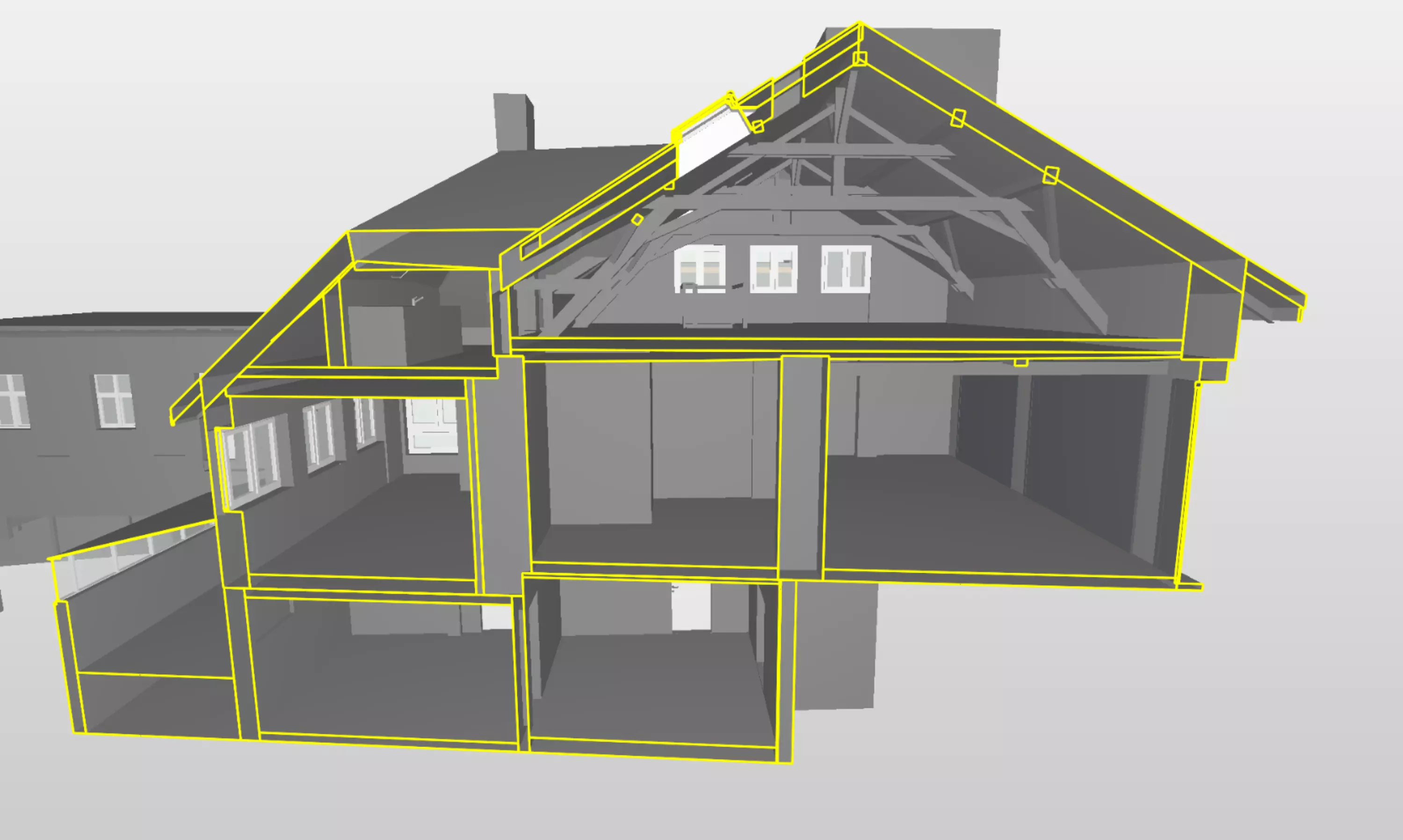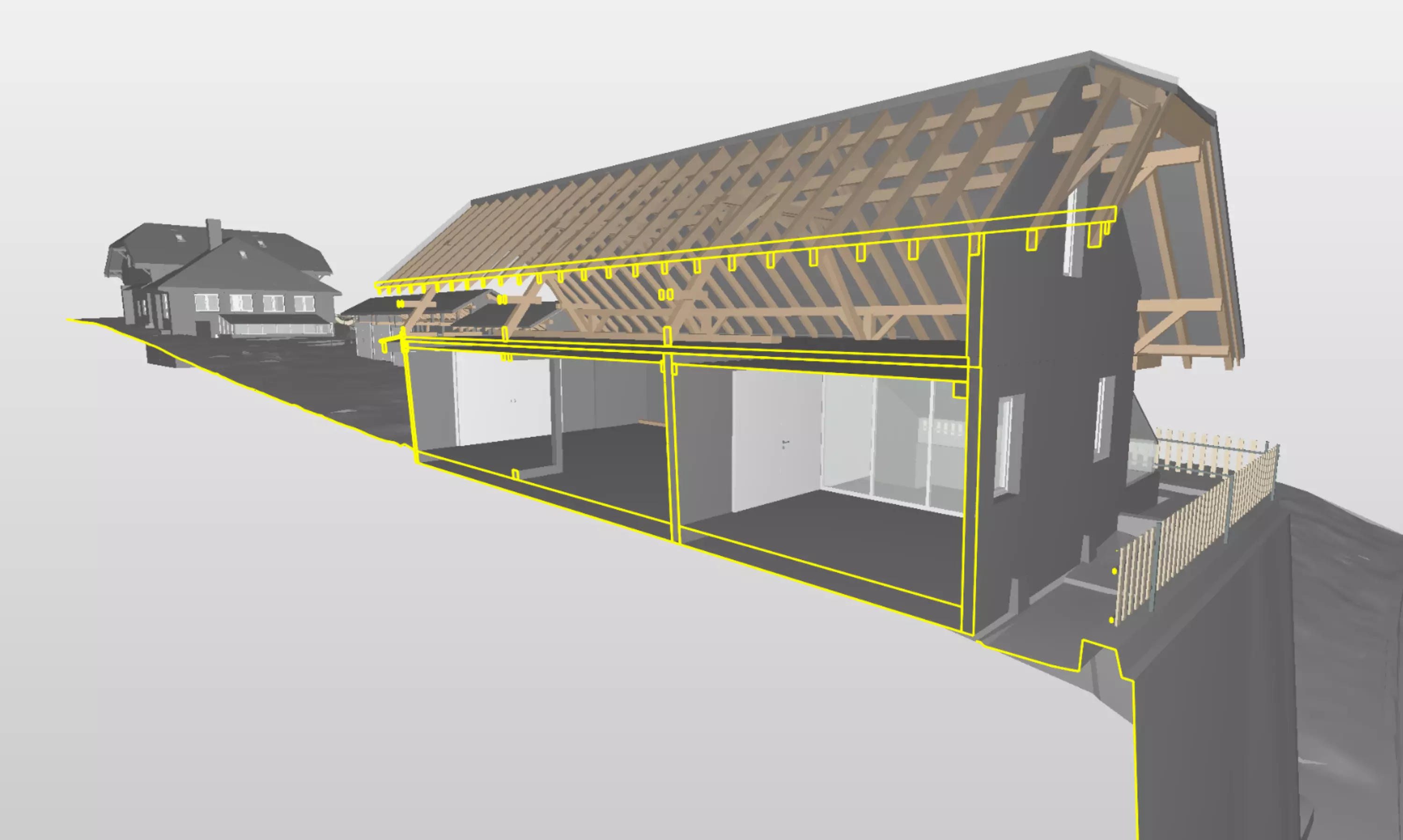 Im Anschluss an die Aufnahmen wurden die Daten im Büro prozessiert. Aus der erstellten, georefenzierten Gesamtpunktwolke wurden anschliessend die Gebäude sowie das Gelände modelliert. Die gewünschten 2D-Pläne (Grundrisse, Schnitte und Ansichten) wurden aus dem erstellten 3D-Modell abgeleitet.