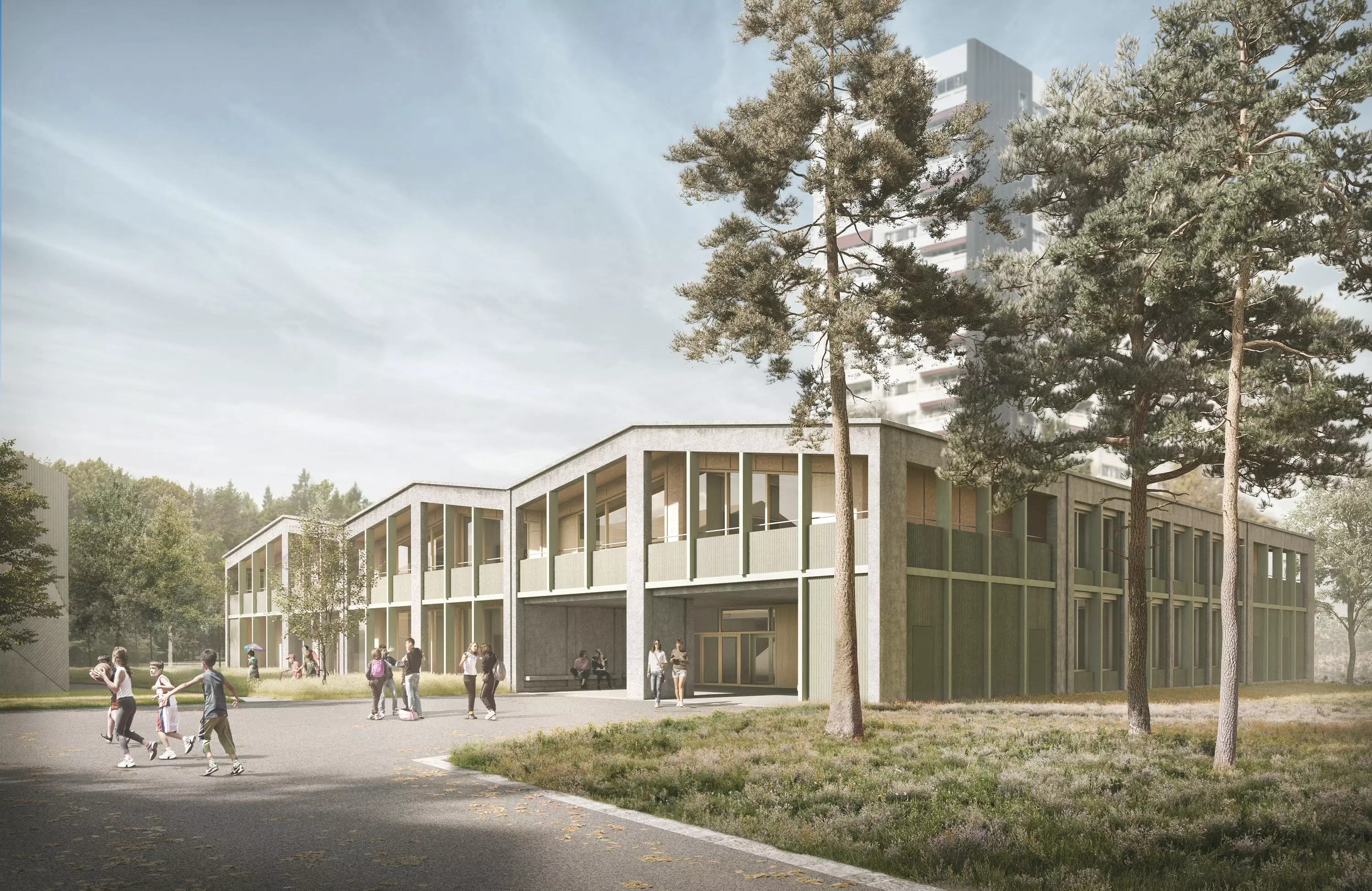 Das neue Schulhausgebäude wird in Mischbauweise in Holz und Beton erstellt. Die Deckenkonstruktion wird mehrheitlich als Holzbetonverbunddecke ausgebildet, die auf einzelnen vorgespannten Betonunterzügen aufgelagert sind. Der vertikale Lastabtrag erfolgt über tragende Wände und vorfabrizierte Stützen. Das Gebäude ist flach in der gut tragfähigen Schotterschicht fundiert.