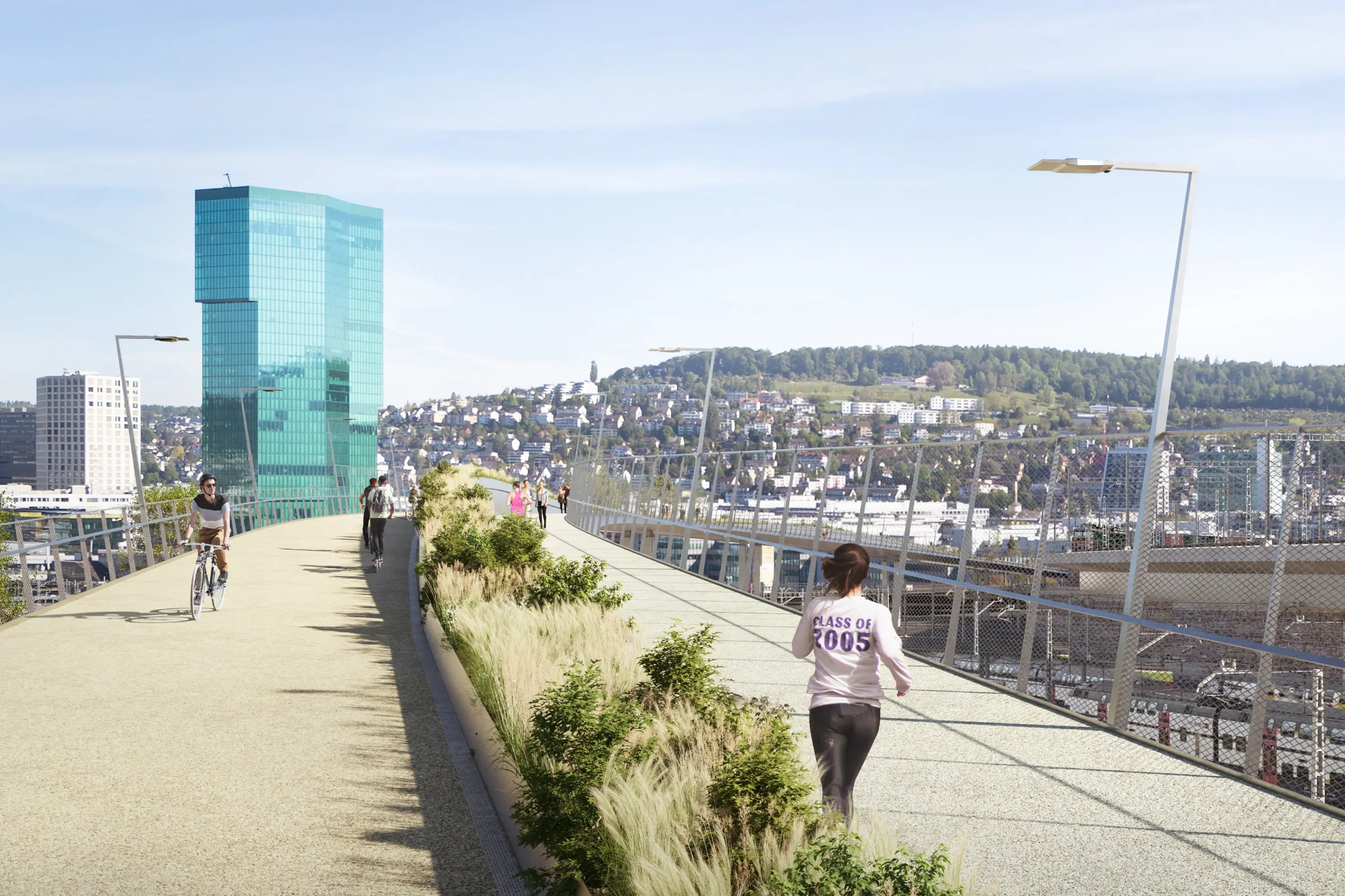 Das Projekt versteht sich nicht nur als Infrastruktur, sondern auch als öffentlicher Freiraum: Als «Landschafts-brücke» konzipiert, verbindet sie Bewegung mit Aufenthaltsqualität und eröffnet neue Blickbeziehungen über die Stadt. Eine klare Trennung von Fuss- und Veloverkehr sowie grosszügige Breiten sorgen für Sicherheit und ein angenehmes Nutzungserlebnis.