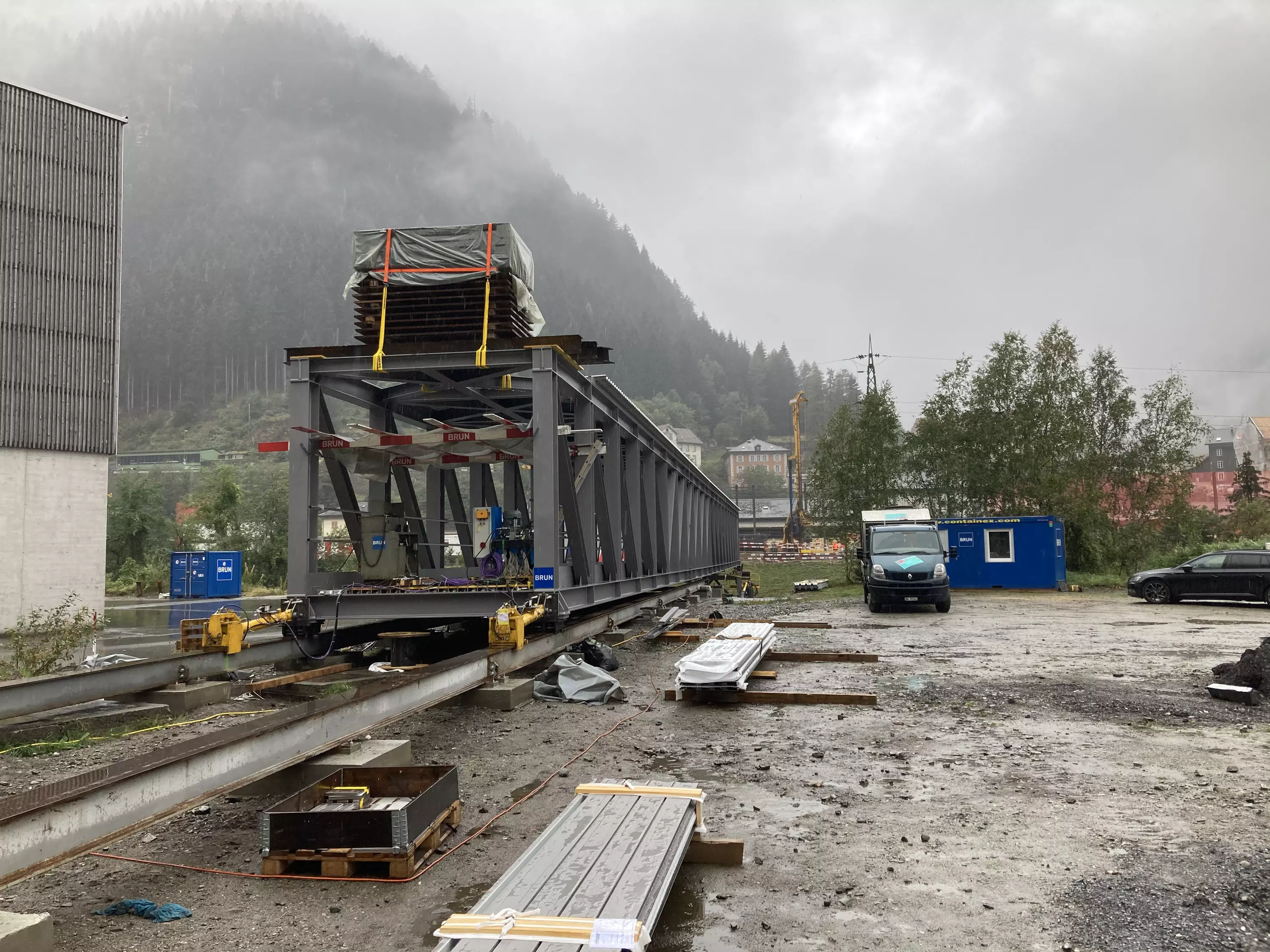 Drei der insgesamt vier Brückenteile wurden östlich der Reuss auf einer Verschubbahn zusammenmontiert und unter einer Hochspannungsleitung über den Mittelpfeiler eingeschoben.