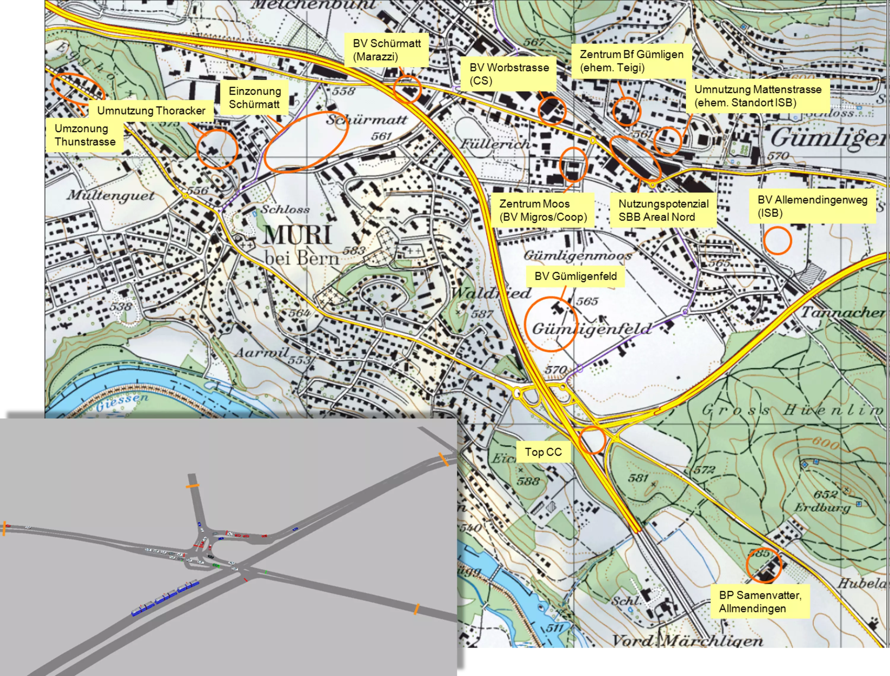 Für verschiedene zukünftige Entwicklungsschwerpunkte sowie massgebende Einzelvorhaben wie auch angedachte verkehrliche Massnahmen waren dazu die Verkehrserzeugungen und die daraus entstehenden Verteilungen der Verkehrsströme abzuschätzen und auch vor dem regionalen Hintergrund zu bewerten. Die allgemeine Verkehrsentwicklung der Region Bern, welche von grosser Bedeutung für die Gemeinde Muri bei Bern ist, war dabei mit einzubeziehen.