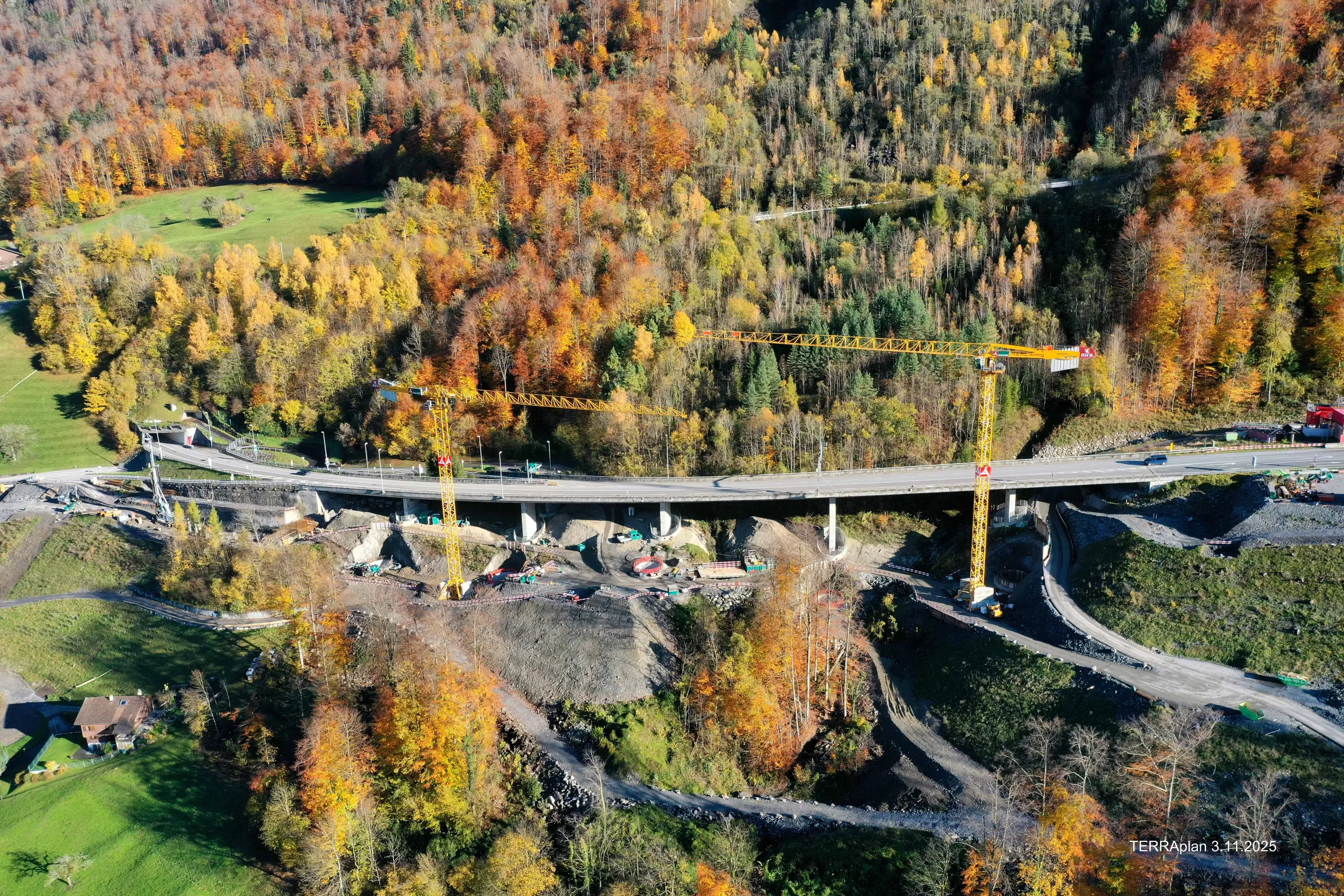 Das Bauwerk überquert einen anspruchsvollen Rutschhang sowie mehrere Gräben und ist in eine komplexe To-pographie eingebettet. Im Nachgang der Brücke entstehen tieffundierte Stützbauwerke, welche die Linienfüh-rung sichern und den Hang stabilisieren. Die Pfeiler werden in bis zu 30 Meter tiefen Schächten direkt auf Fels fundiert.