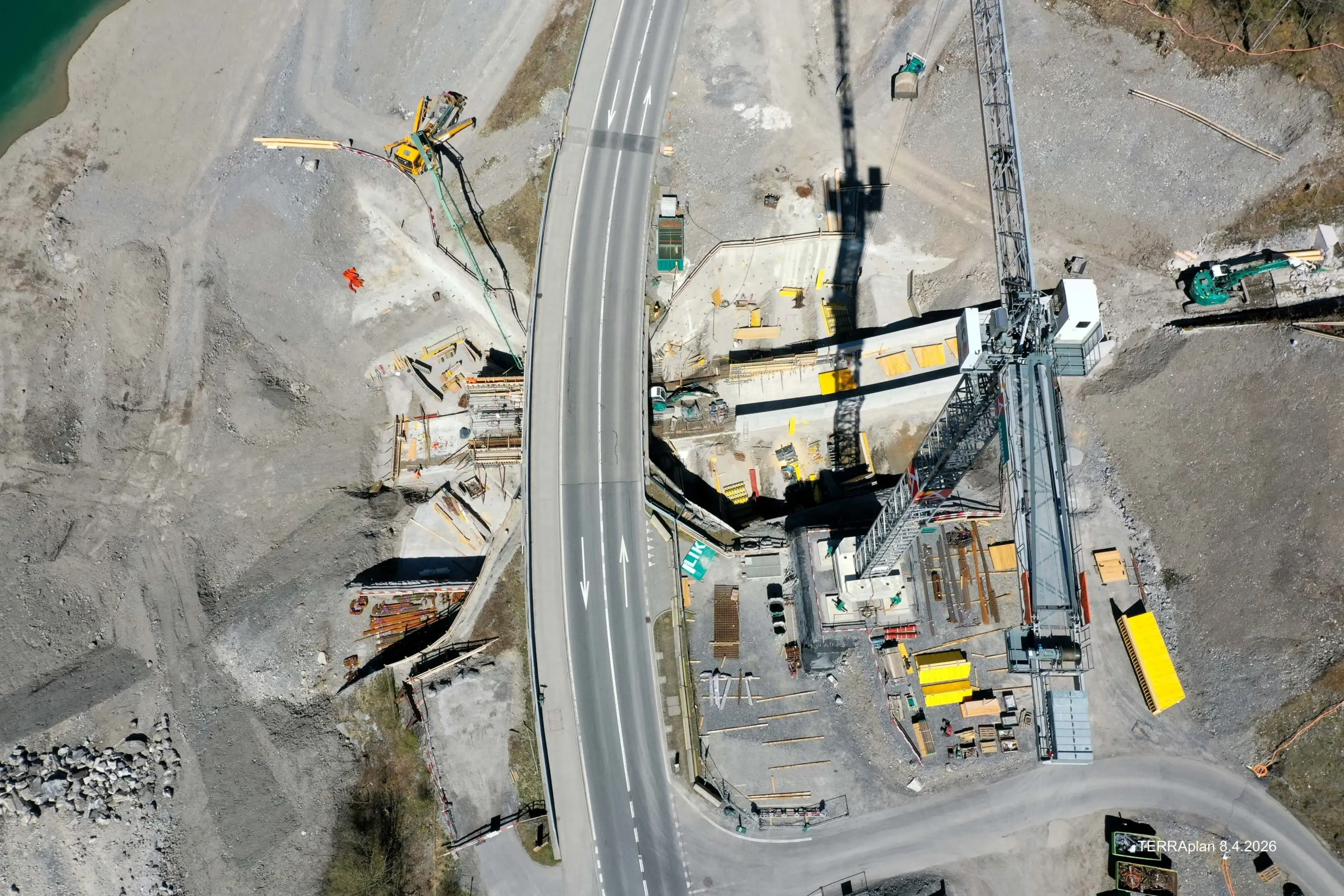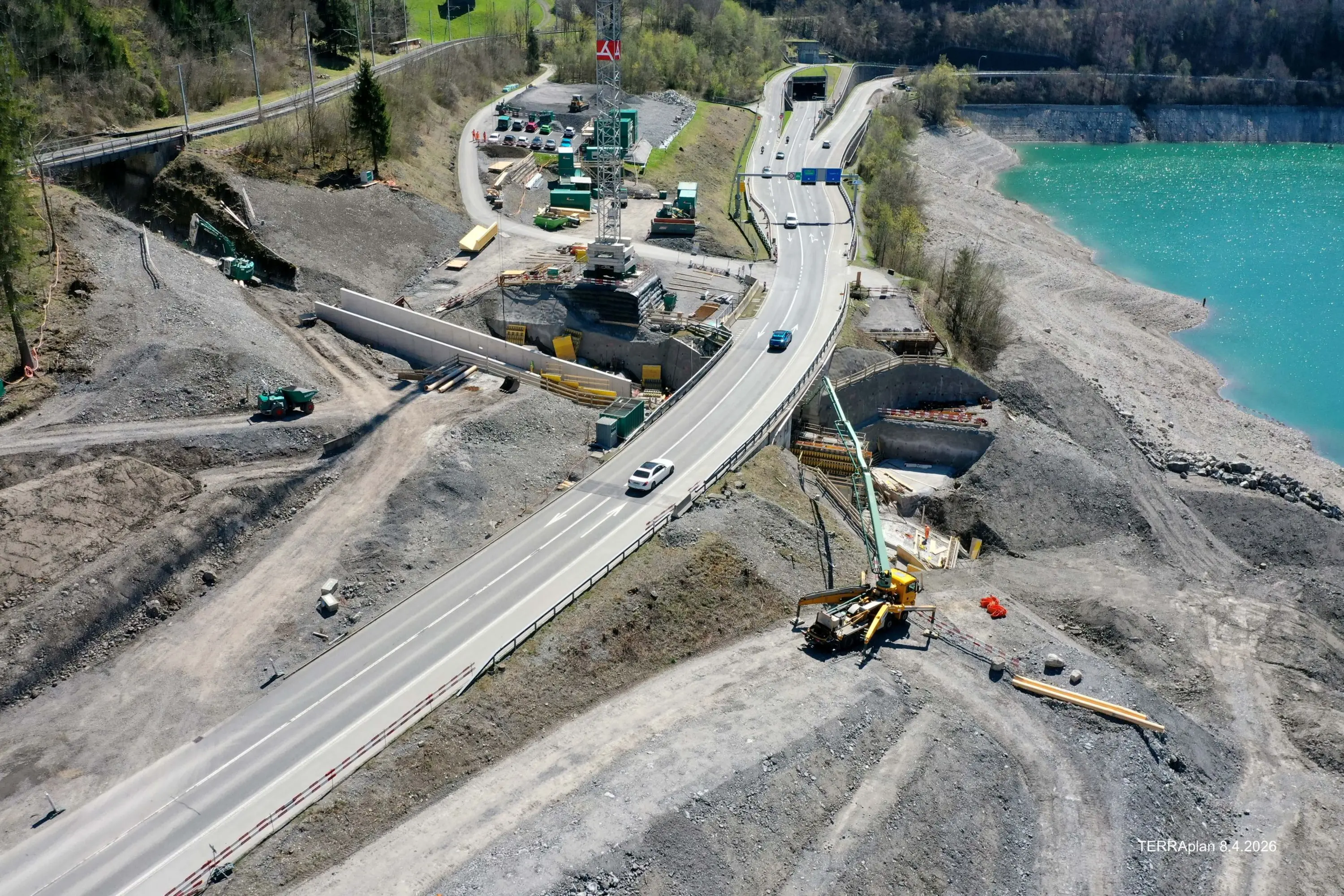 Ein zentrales Element ist der Neubau des Steinlaui-Gerinnes, das aufgrund grosser Murgangrisiken umfassend neu gestaltet wird. Ein zusätzlicher Auffangraum im Lungerersee trägt dazu bei, Geschiebe sicher zurückzu-halten und die Infrastruktur langfristig zu schützen. Entlang des Trassees entstehen zudem mehrere neue Brücken sowie anspruchsvolle, teils rückverankerte Stützbauwerke.