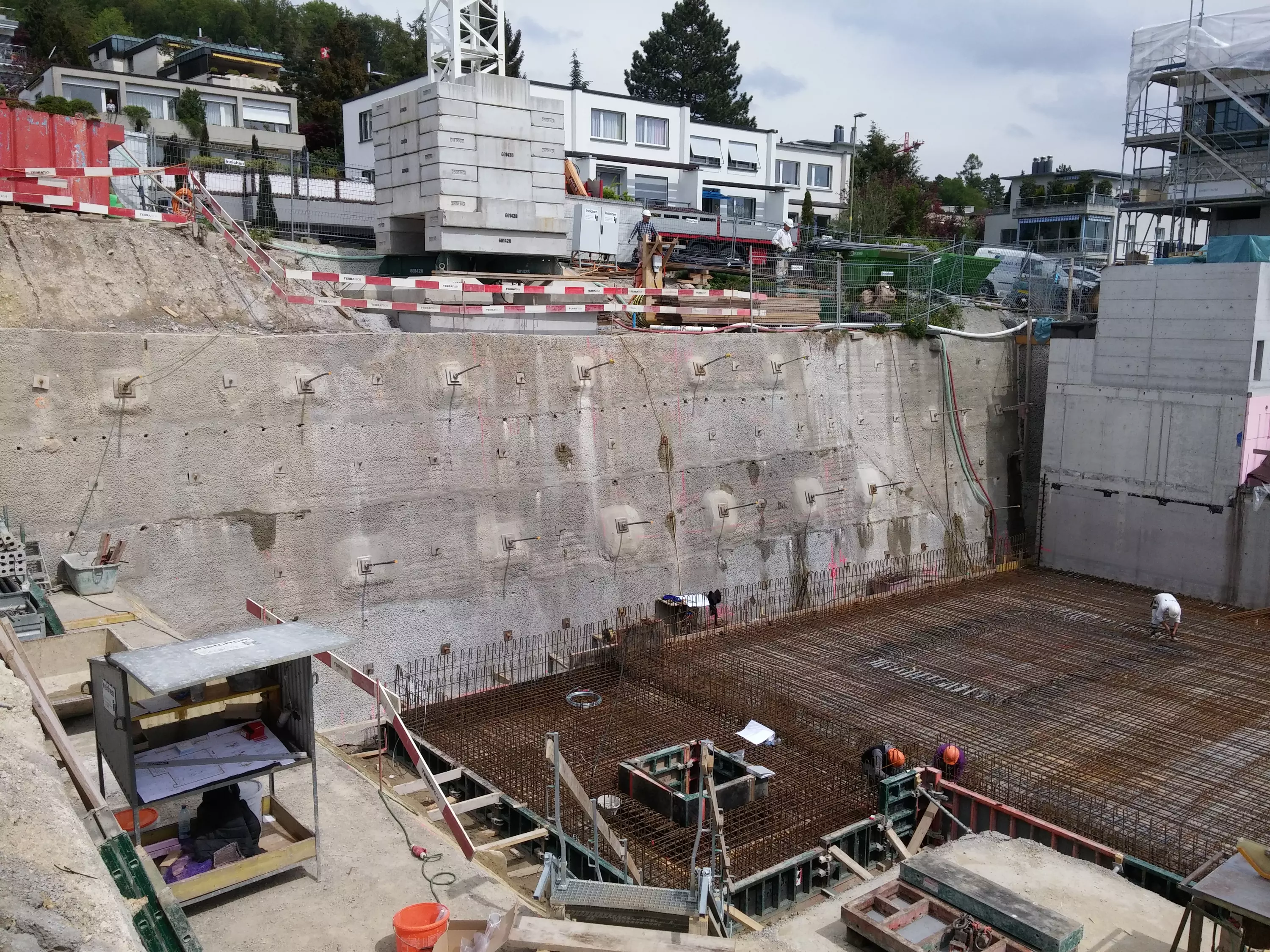 Aufgrund der engen Platzverhältnisse und der Hanglage musste ein nahezu vertikaler Baugrubenabschluss geplant werden. Es wurde eine Nagelwand geplant und ausgeführt.