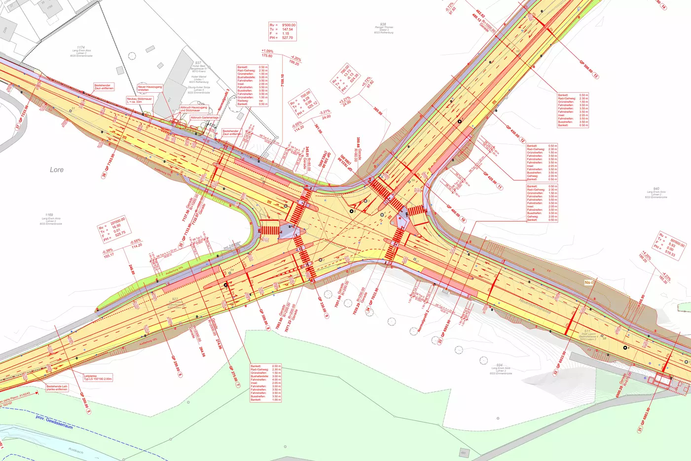 Auf Basis des KVM und der vorhandenen Verkehrserhebungen an der LSA wurden Verkehrsmengengerüst und Verkehrsflussdiagramm entwickelt. Diese Leistungen hat ein externes Ingenieurbüro erbracht und wurde von EBWSB koordiniert. Auf Basis des Mengengerüsts wurden die Knotenvarianten jeweils überprüft und die Anforderungen an die Knotenäste und die Rückstaulängen definiert. Die Spurlängen sind dabei so ausgelegt, dass der öffentliche Verkehr priorisiert werden kann und in einzelnen Knotenästen Dosierungen im MIV möglich sind. Im Bereich der Knotenäste sind Kunstbauten und Bachdurchlässe erforderlich.