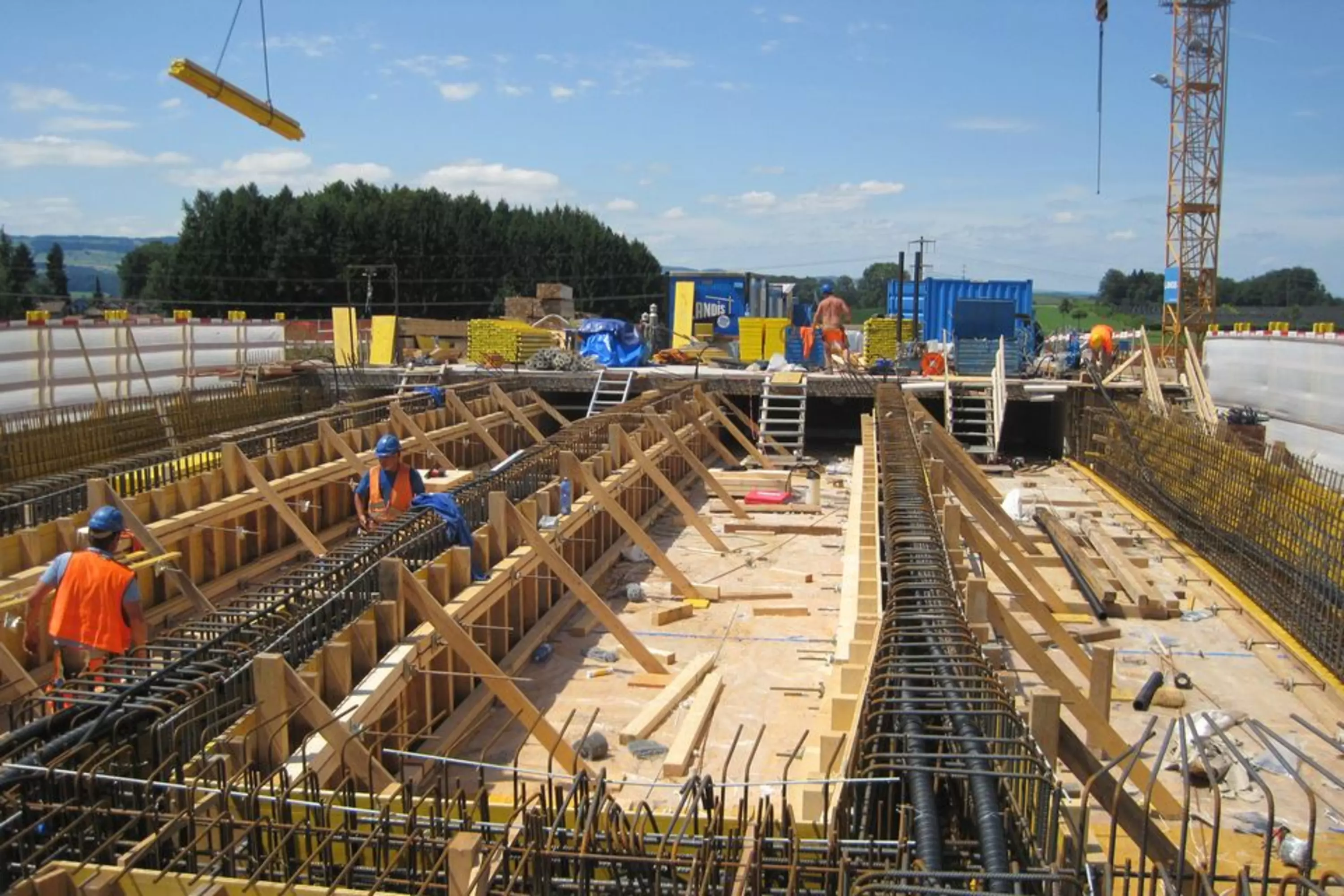 Die vorgespannte Stahlbetonbrücke wurde unter Verkehr auf einem Lehrgerüst aus Stahl erstellt.