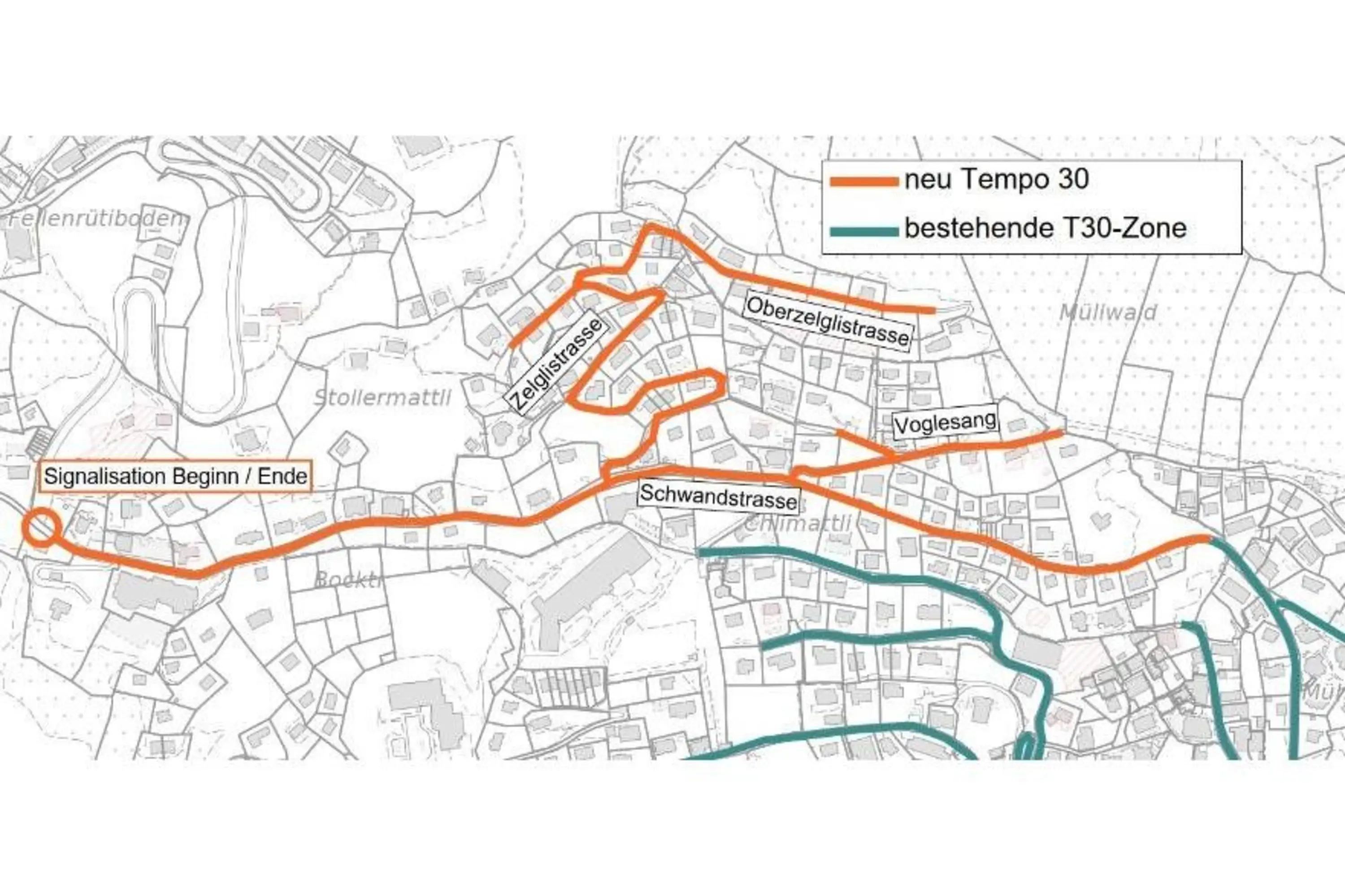 Auf der Schwandstrasse und den angrenzenden Quartieren wurde daraufhin die Umsetzung einer Tempo-30-Zone geprüft. Mit einer maximalen Geschwindigkeit von 30 km/h kann die Situation verbessert werden. Die Reduzierung der Höchstgeschwindigkeit zeigt sich als notwendig sowie zweck- und verhältnismässig.
