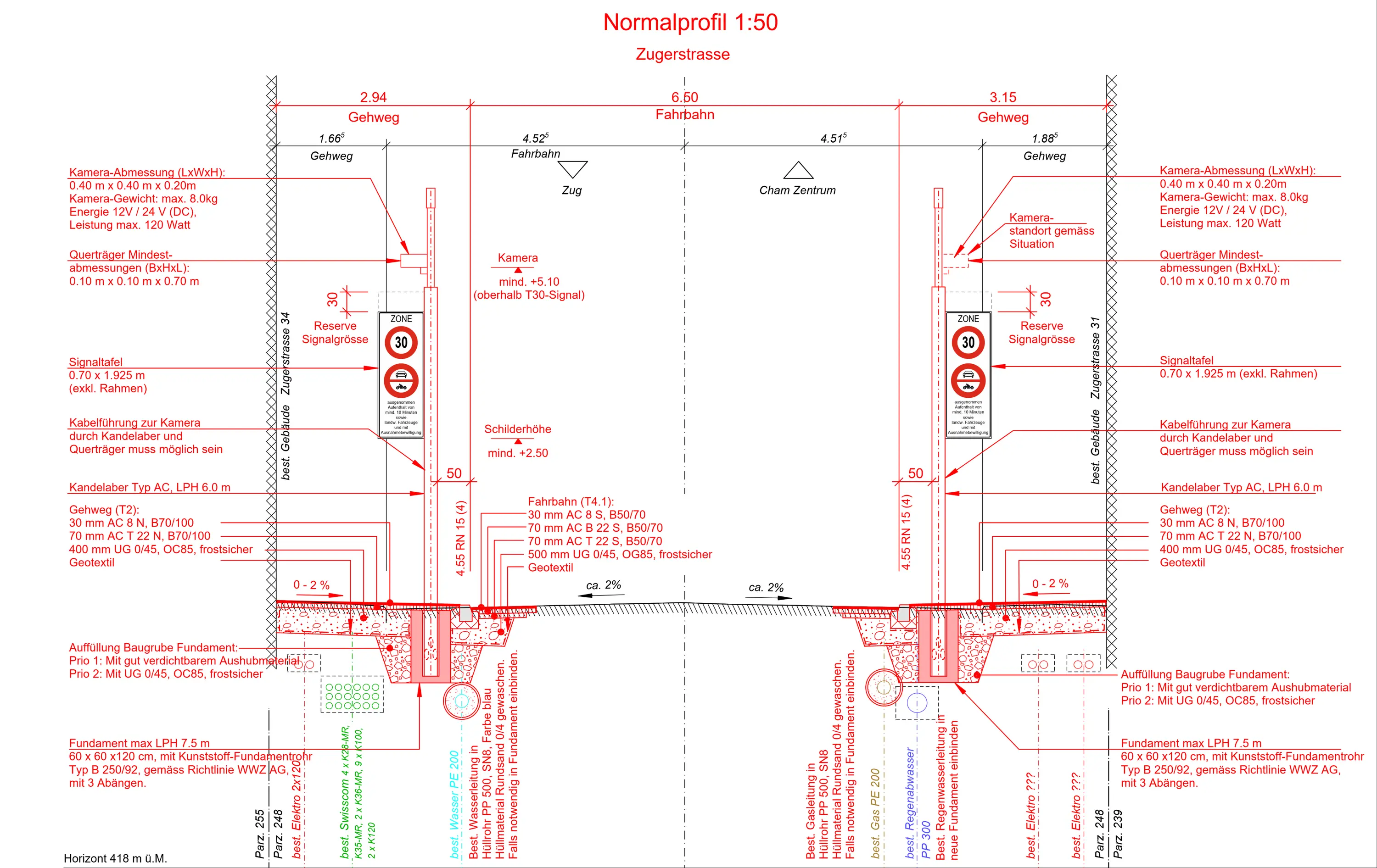 Umfassende Verkehrserhebungen sowie Analysen der Verkehrsströme machen deutlich, dass das Neubautrassee der Umfahrung Cham–Hünenberg (UCH) alleine nicht ausreichend Verkehr anzieht. Die Entlastungsziele sollen daher mit flankierenden Massnahmen erreicht werden. In einem Prozess mit öffentlicher Mitwirkung hat sich die flankierende Massnahme das autoarme Zentrum (AAZ) deutlich durchgesetzt. An den Ein- und Ausfahrten (Pforten) verhindert ein Fahrverbot den ungehinderten Zutritt und somit die Durchfahrt durch das Ortszentrum. Zur Überwachung der Aufenthaltsdauer und Durchsetzung des Durchfahrtsverbots von Fahrzeugen im Perimeter des autoarmen Zentrums Cham soll ein Kamerasystem zur automatischen Nummernschilderkennung (ANPR, Automatic Numberplate Recognition) an den Standorten der Ein- und Ausfahrten (Pforten) eingesetzt werden. Das Projekt umfasst den Neubau der Pfortenfundamente inkl. Horizontalversätze für die spätere Fahrbahnverschmälerung mit dem Drittprojekt Umgestaltung AAZ, die Ausschreibung + Realisierung des Kamerasystems sowie die Planung der elektrischen Erschliessung der Pforten.
