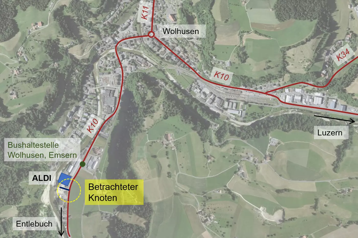 In Wolhusen ist eine neue Filiale, mit Erschliessung ab der angrenzenden Kantonsstrasse, geplant. Im Rahmen des Gutachtens war zu klären, ob Rückstau auf der Kantonsstrasse zu erwarten ist und für die Knotenausgestaltung ein Vorsortierstreifen erforderlich ist. Für die verkehrlich massgebende Stunde des Tages wurde ein Fahrtengerüst erstellt. Grundlage hierfür boten unter anderem eine kantonale Verkehrszählstelle, die projektierten Parkfelder und Erfahrungswerte einer Vergleichsfiliale. In einer Software zur Prüfung der Verkehrsqualität wurde der T-Knoten mit dem abgeschätzten Verkehrsaufkommen belastet. Die Untersuchung ergab eine gute Leistungsfähigkeit des Knotens. Zur Verifizierung der Ergebnisse der Sensitivitätsprüfung wurden die Berechnungen mit einem höheren Kundenaufkommen und veränderter Aufteilung am Knoten wiederholt. Auf der Kantonsstrasse konnte für den prognostizierten Zustand keine wesentliche Behinderung des Verkehrsflusses durch Rückstau der projektierten Einfahrt festgestellt werden. Ein Vorsortierstreifen ist aus Sicht der Gesamtverkehrsqualität nicht erforderlich.