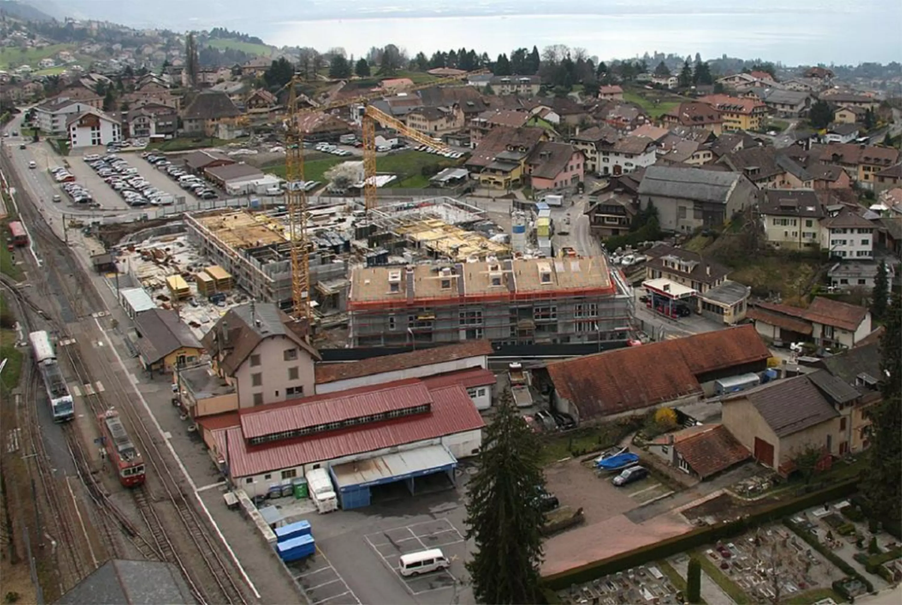Située en face de la gare de Blonay, cette importante réalisation se compose de 3 bâtiments locatifs, comportant 89 appartements, d'une banque, d'une poste, des commerces ainsi que d'un bâtiment administratif (Maison de commune). Un abri PC de 102 places a également été réalisé. Soit un total de 4 immeubles, le tout relié par un bâtiment bloc d'une surface de 60 m x 80 m, de 2 sous-sols, composés d'une surface commerciale et d'un parking souterrain de 176 places sur deux niveaux.